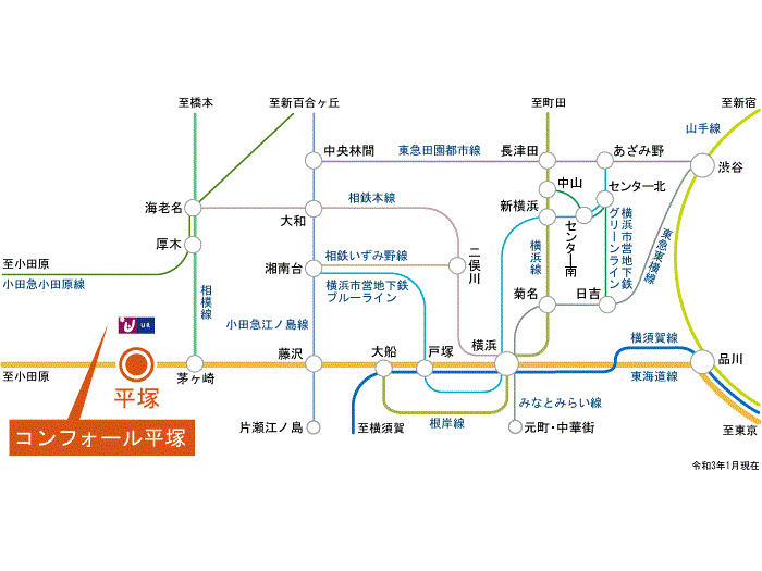 Odakyu Odawara Line 『 Hon Atsugi Sta. 』 38 min by bus 『コンフォール平塚前』 Bus Stop 1 min walk Odakyu Odawara Line 『 イセハラ Sta. 』 28 min by bus 『コンフォール平塚前』 Bus Stop 10 min walk |