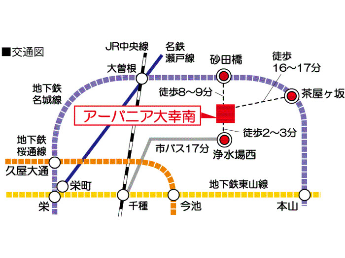Nagoya Municipal Meijo Line 『 Ozone Sta. 』 25 min walk Nagoya Municipal Meijo Line 『 Chayagasaka Sta. 』 16 min walk |