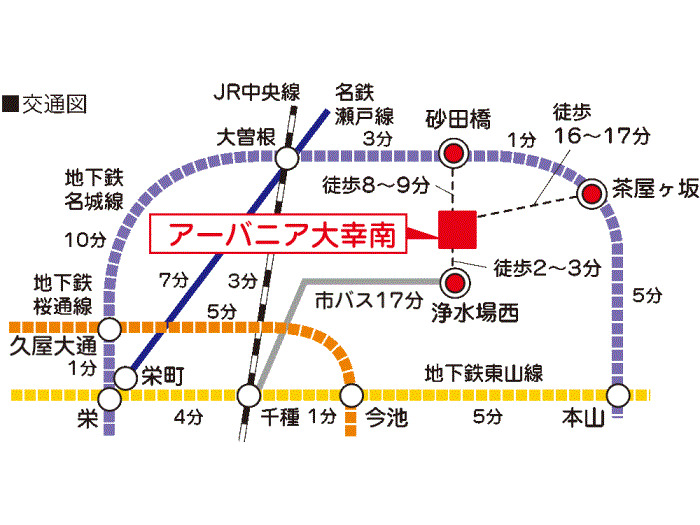 Nagoya Municipal Meijo Line 『 Ozone Sta. 』 25 min walk Nagoya Municipal Meijo Line 『 Chayagasaka Sta. 』 16 min walk |