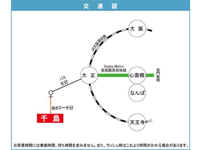 Osaka Metro Mido-suji Line 『 Nanba Sta. 』 18 min by bus 『大正区役所前』 Bus Stop 3 min walk Nankai Shiomibashi Line 『 Ashihara-cho Sta. 』 29 min walk |
